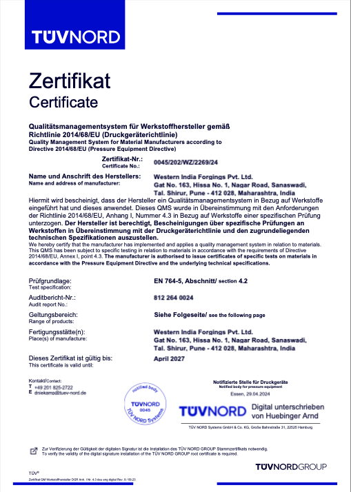 - PED 97/23/EC from DNV-GL for Pressure Vessel applications